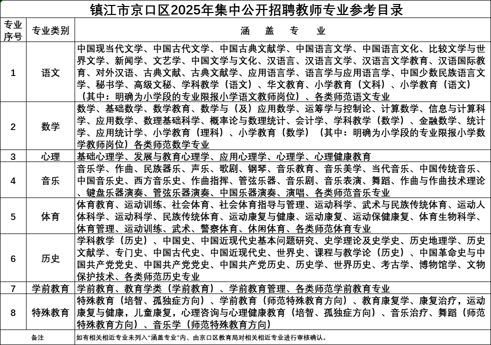 (七)招聘岗位、人数和所要求的学历、专业等资格条件详见《镇江市京口区2025年集中公开招聘教师岗位表》(附件1,下简称《岗位表》),专业条件要求参照《镇江市京口区2025年集中公开招聘教师专业参考目录》(附件2,下简称《专业参考目录》)进行查核。