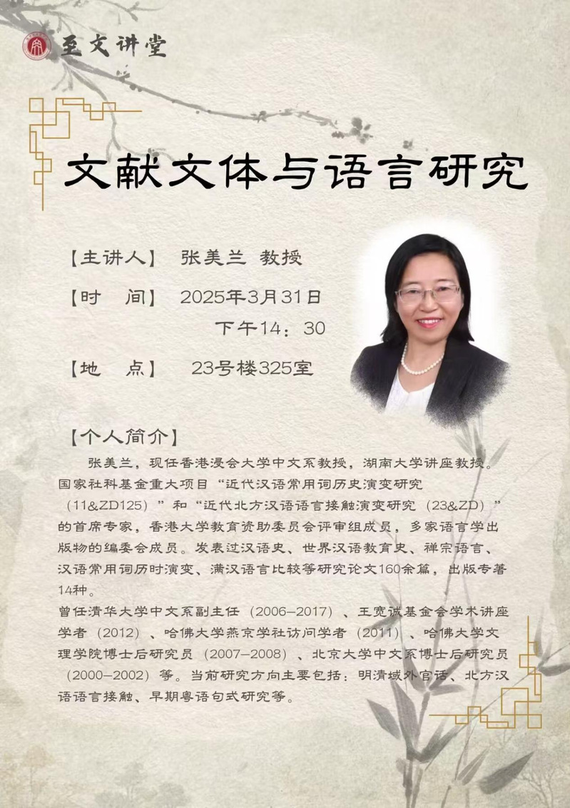 3月31日下午,香港浸会大学中文系教授、湖南大学讲座教授张美兰应邀做客“至文讲堂”,为师生做题为“文献文体与语言研究”的精彩演讲。
